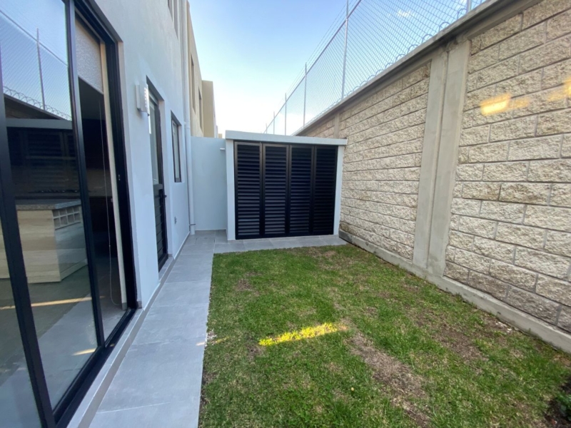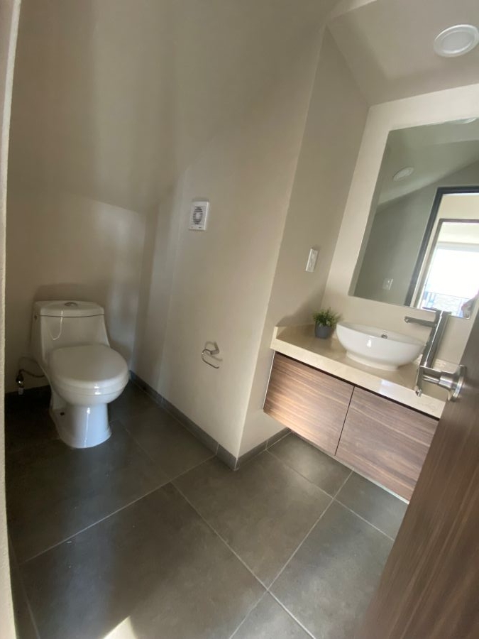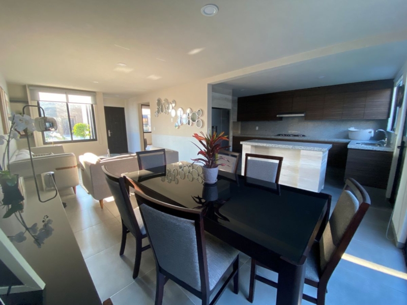 Planta Baja- Sala-comedor, cocina con barra de granito, 1/2 baño, área de lavado, jardín privado, 2 cajones de estacionamiento