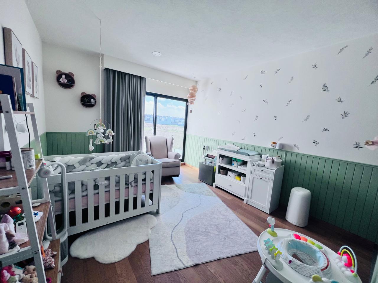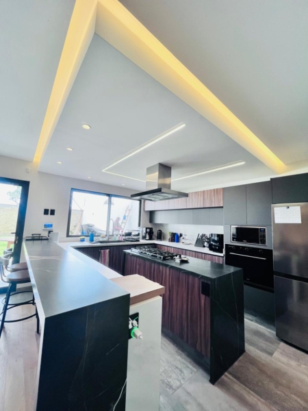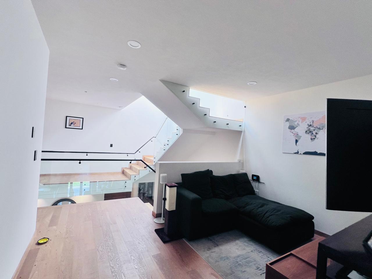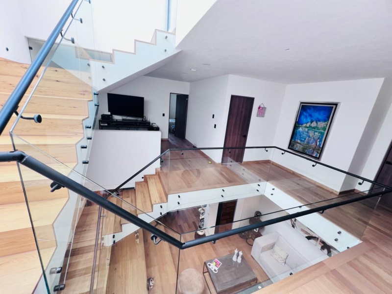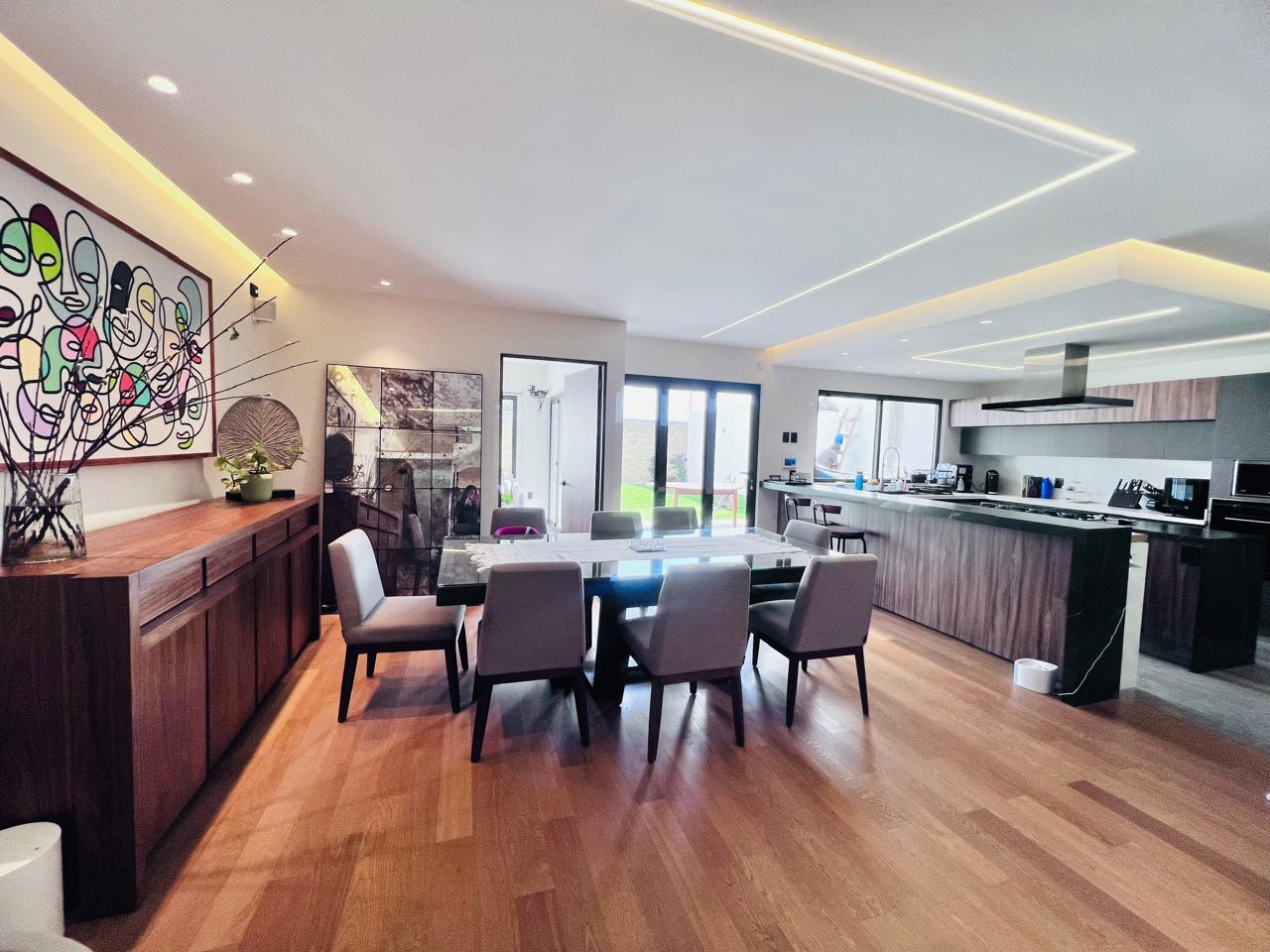 PLANTA BAJA: Estacionamientos techados para 4 autos (pérgola de cristal biselado), con 2 cargadores para auto electrico, , acceso de servicio directo al jardín trasero, bodega, closet de visitas, medio baño de visitas, sala a doble altura, comedor con luz indirecta, pisos de madera de ingeniería i(importada), cocina integral con isla, campana y parrilla al centro (también cuentaa con luz indirecta en techos) torre de hornos, tradicional y microondas , amplia alacena, cava bajo escaleras con cristal, templado , estudio o terraza, jardin de muy buen tamaño.